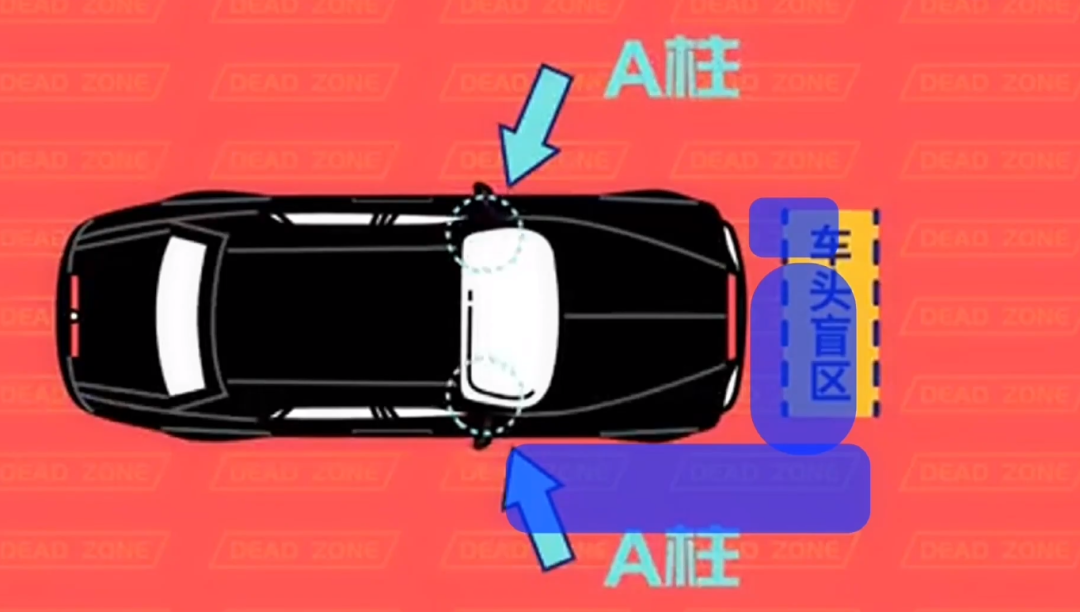 國內駕駛位設置在左邊,所以車子右側的盲區比左邊多。左側只有A柱遮擋形成的小盲區,但右側則有兩個地方:一個同樣是由于A柱遮擋造成的盲區,但因為距離原因,相對左側的區域會顯得稍大;另外一側是靠近右側車身旁邊、車子倒后鏡往車頭延伸的區域。